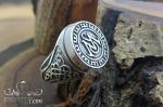 This massive 925 sterling silver signet ring features a distinctive monogram in the center. The round face is accented with a contrasting black finish, enhancing the depth of the relief and making the symbol more prominent. A decorative pattern is placed around the perimeter, creating the effect of a classic seal and lending a prestigious touch to the ring.