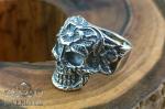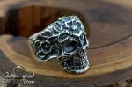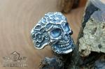 The photo shows a silver skull ring adorned with a floral pattern. It has a unique design that attracts attention and sparks interest. It will be a great addition to your style and will help you stand out.