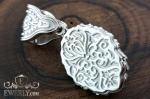 The reverse side is adorned with a decorative pattern featuring flowing floral lines and symmetrical elements. The surface is carefully crafted, making the piece aesthetically pleasing from all sides. The eyelet is embossed with a patterned relief and harmoniously complements the overall design.