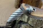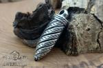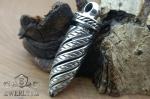 The body is covered with diagonal coils reminiscent of twisted feathers: each stripe has a deepened, blackened outline and a central vein, creating a striking contrast between the polished edges and darkened grooves. The pattern is evenly repeated along the entire length, forming a dynamic spiral pattern.